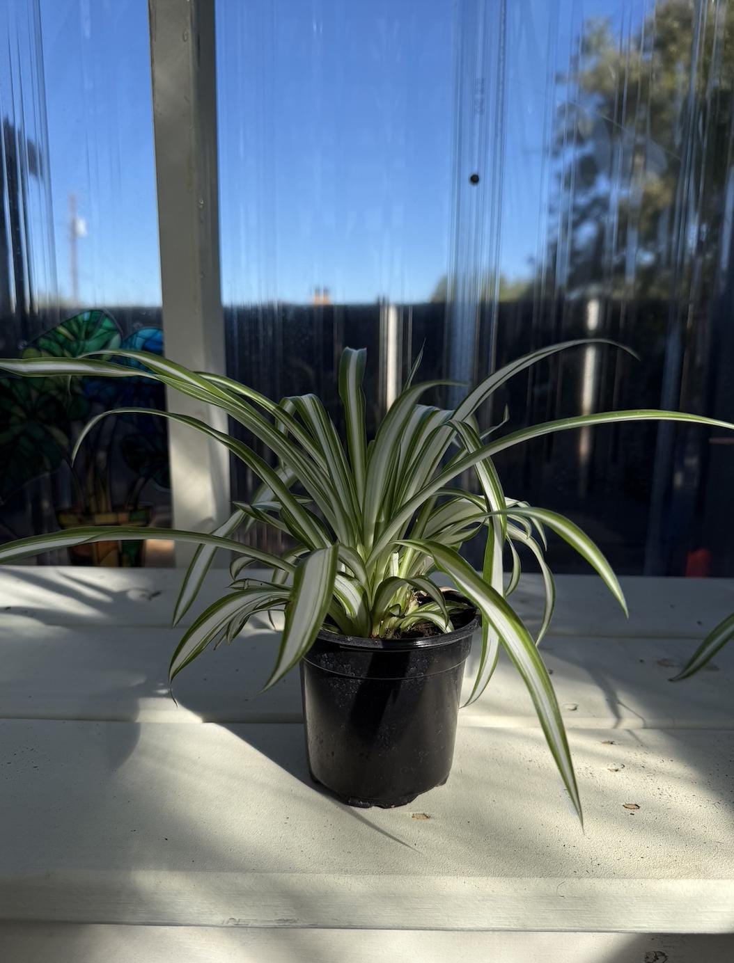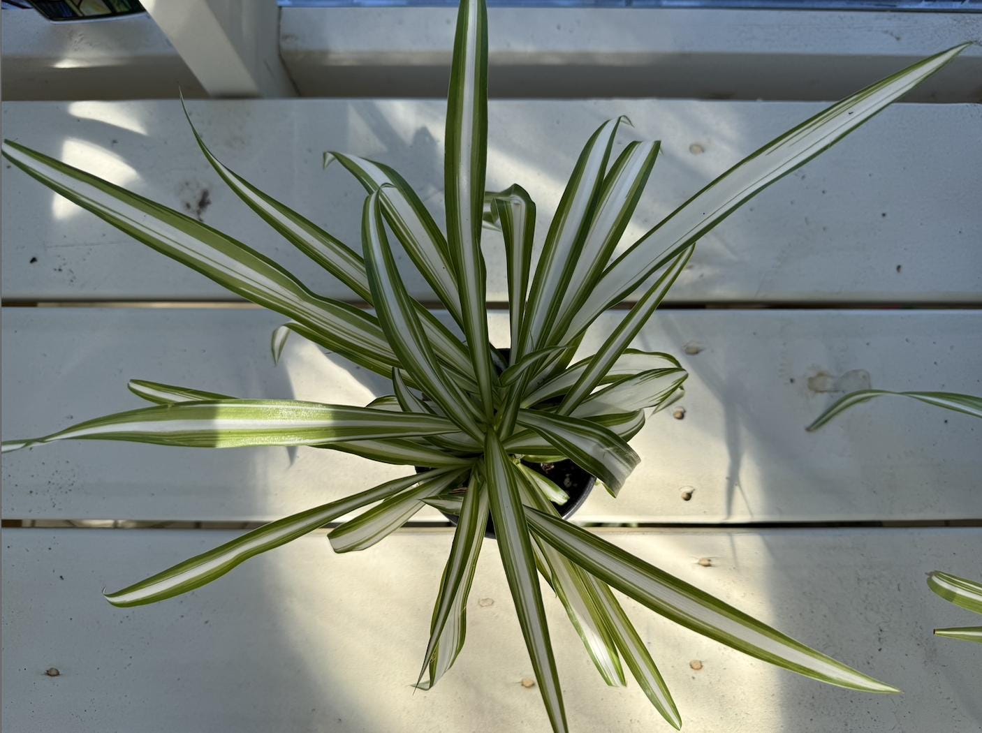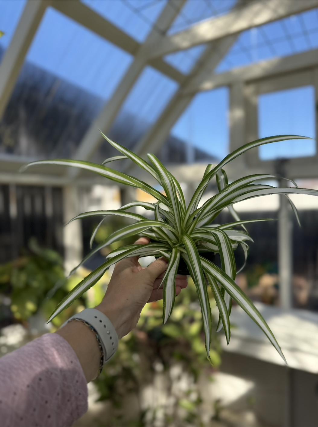 Botanical Name: Chlorophytum comosum. Thrives in medium to indirect bright sunlight. Direct sunlight can cause brown tips. Can adapt to low light, though growth will slow. This plant will arrive in a plastic growers pot with drainage holes. Pot color may vary. Comes in a 4" pot.