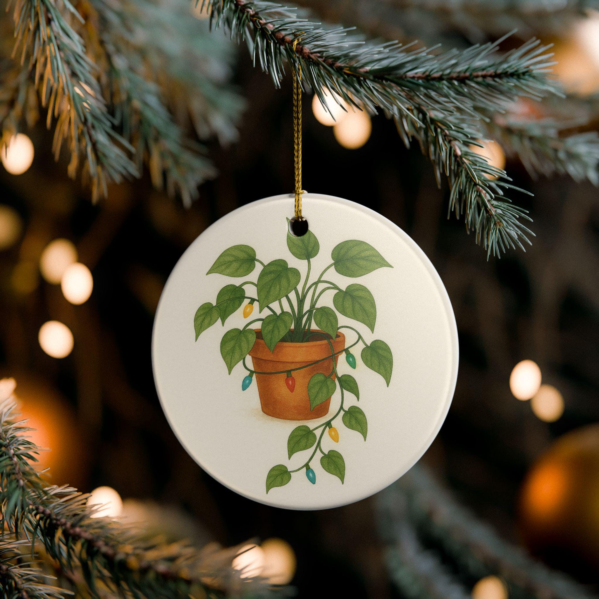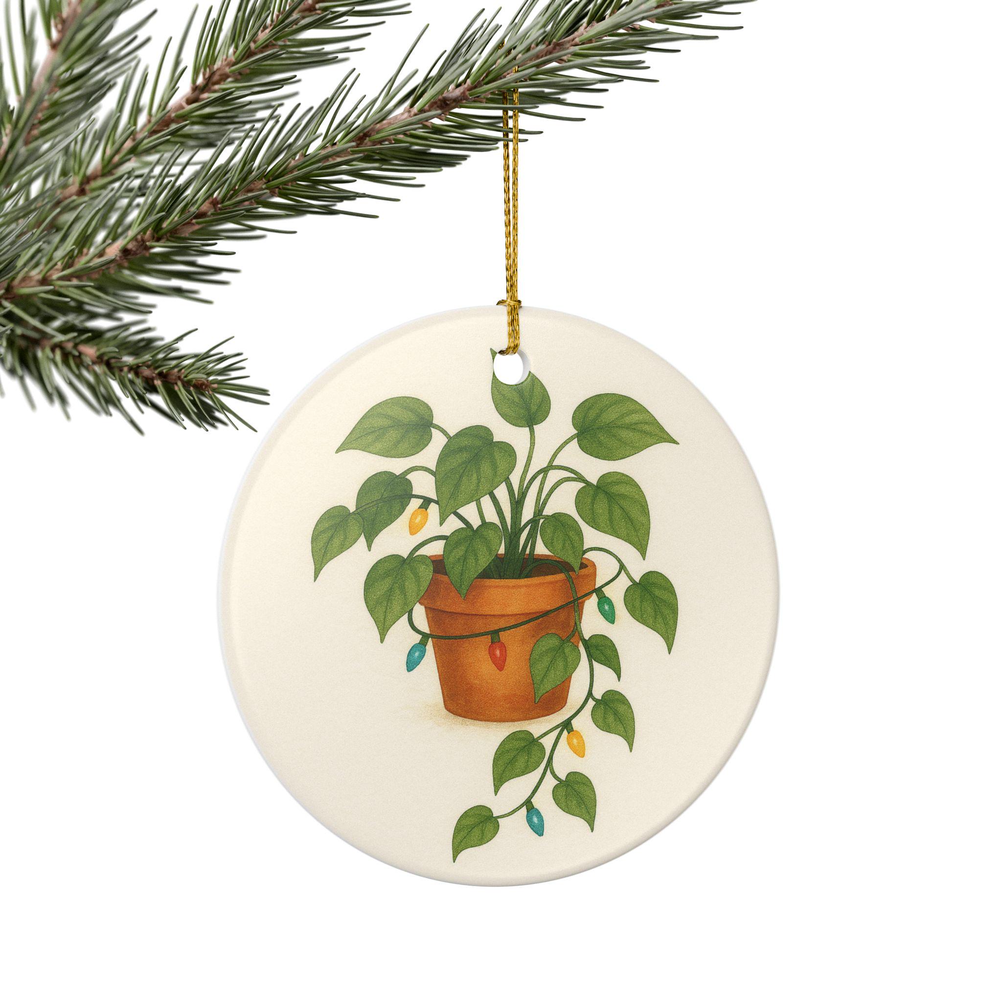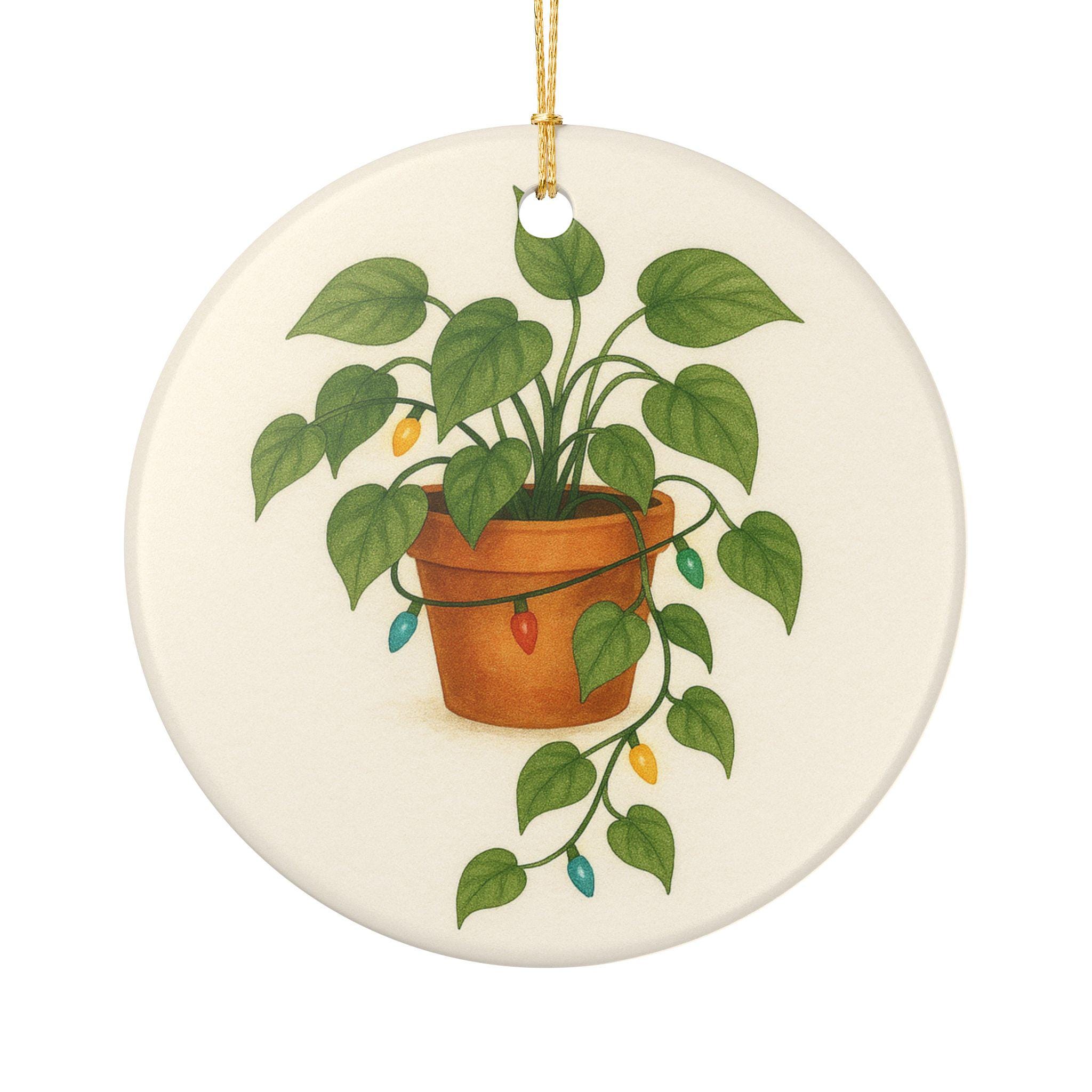 A hand-painted-feel ceramic ornament that brings quiet botanical charm to small spaces. The round, glossy white disk features a matte-printed potted Pothos wrapped in tiny string lights — a gentle mix of houseplant love and holiday warmth. Lightweight yet sturdy, it hangs from a gold string so you can tuck it into wreaths, hang it on a tree branch, or add it to a plant shelf as a small accent. Each piece is printed on both sides and finished with UV-cured inks for lasting color. The subtle, neutral background keeps the illustration calm and cozy, inviting a soft, homey touch wherever it’s displayed.
