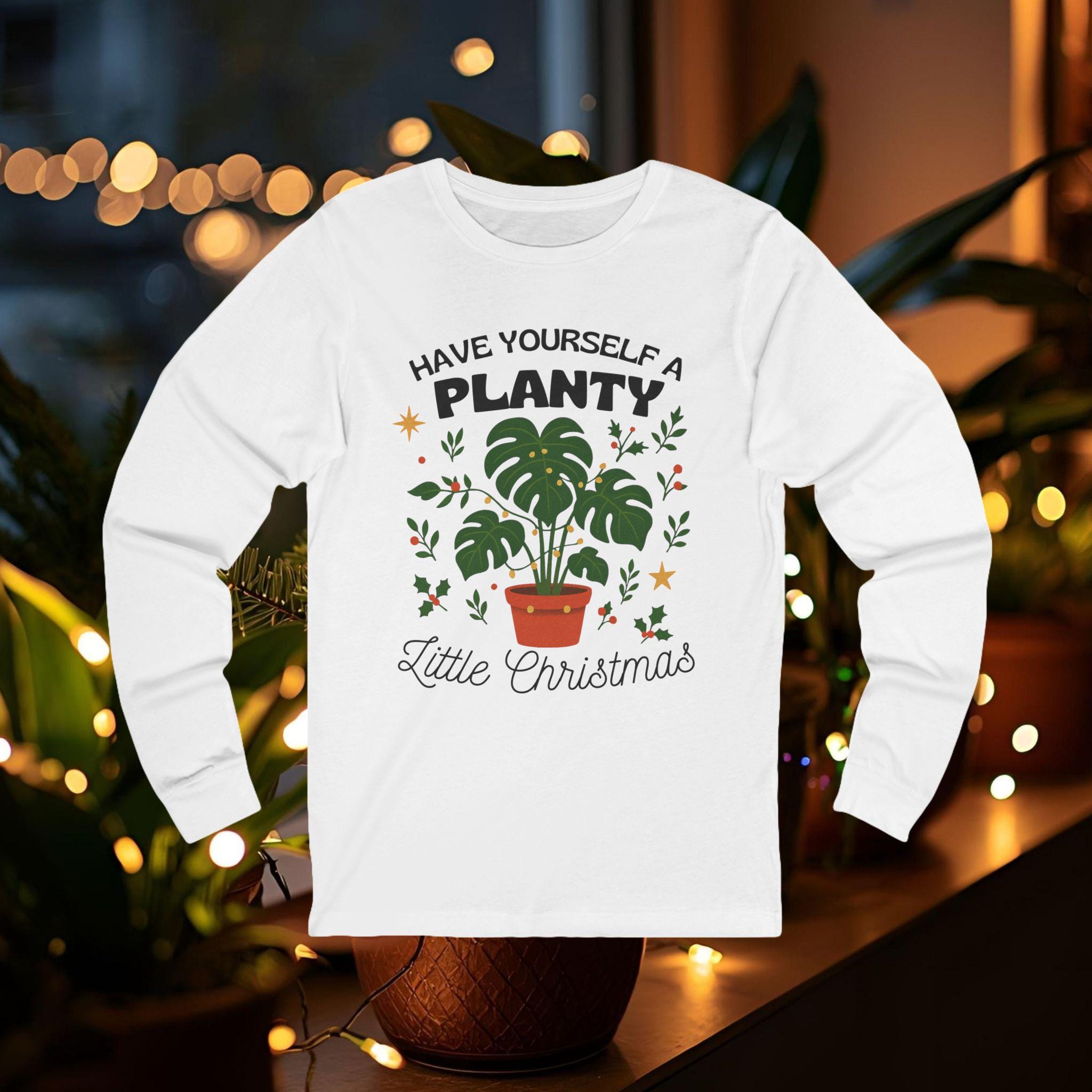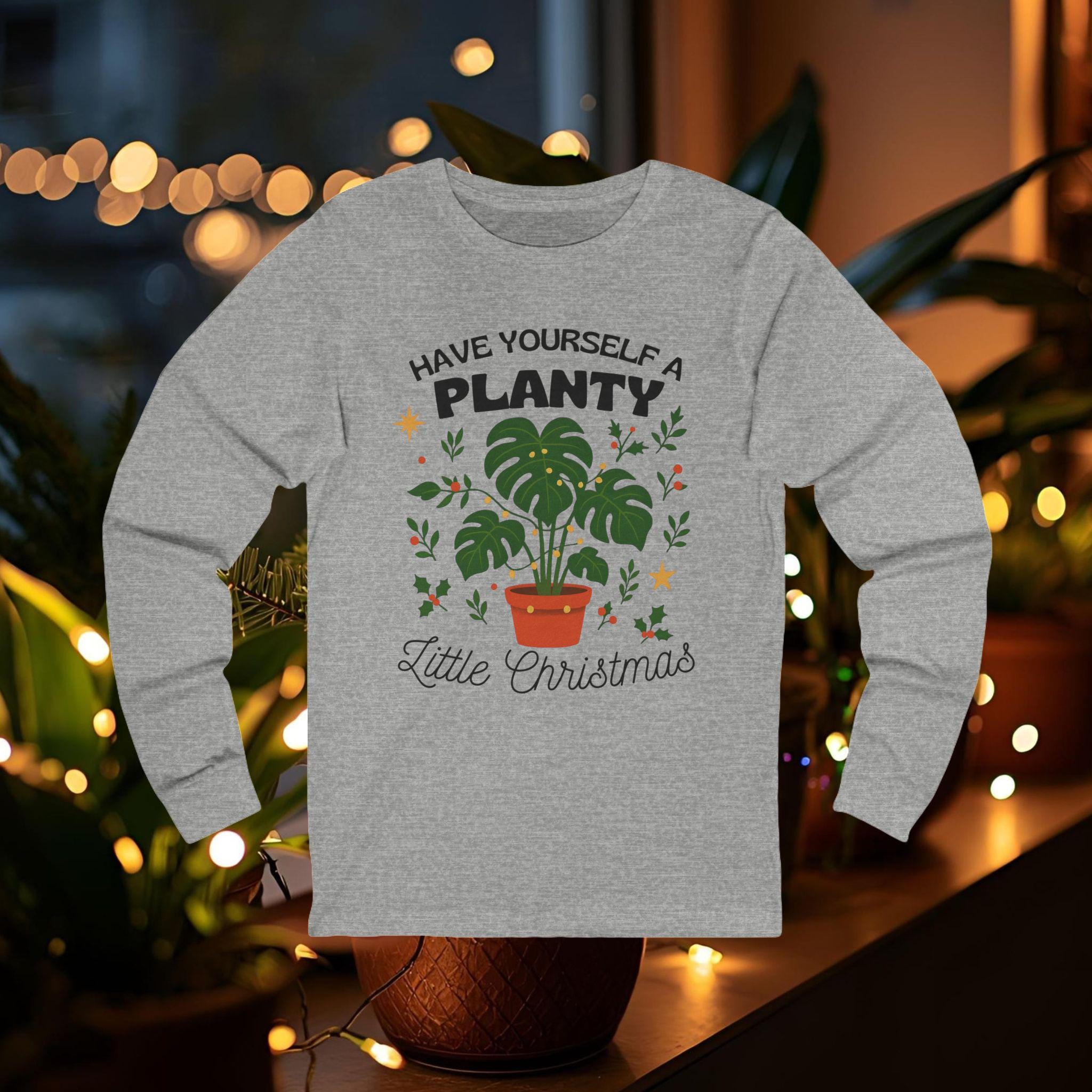 Soft, lightweight long sleeve tee made for the plant-obsessed who love cozy holiday vibes. A simple Monstera in a terracotta pot sits beneath the hand-lettered phrase “Have Yourself a Planty Little Christmas,” surrounded by tiny stars and sprigs. The retail fit and breathable Airlume cotton feel gentle on the skin while the ribbed collar, shoulder tape, and side seams keep the shirt looking crisp after repeated wears. Wear it while tending to your urban jungle, curling up with a new houseplant book, or exchanging small, thoughtful gifts at a low-key winter gathering.
