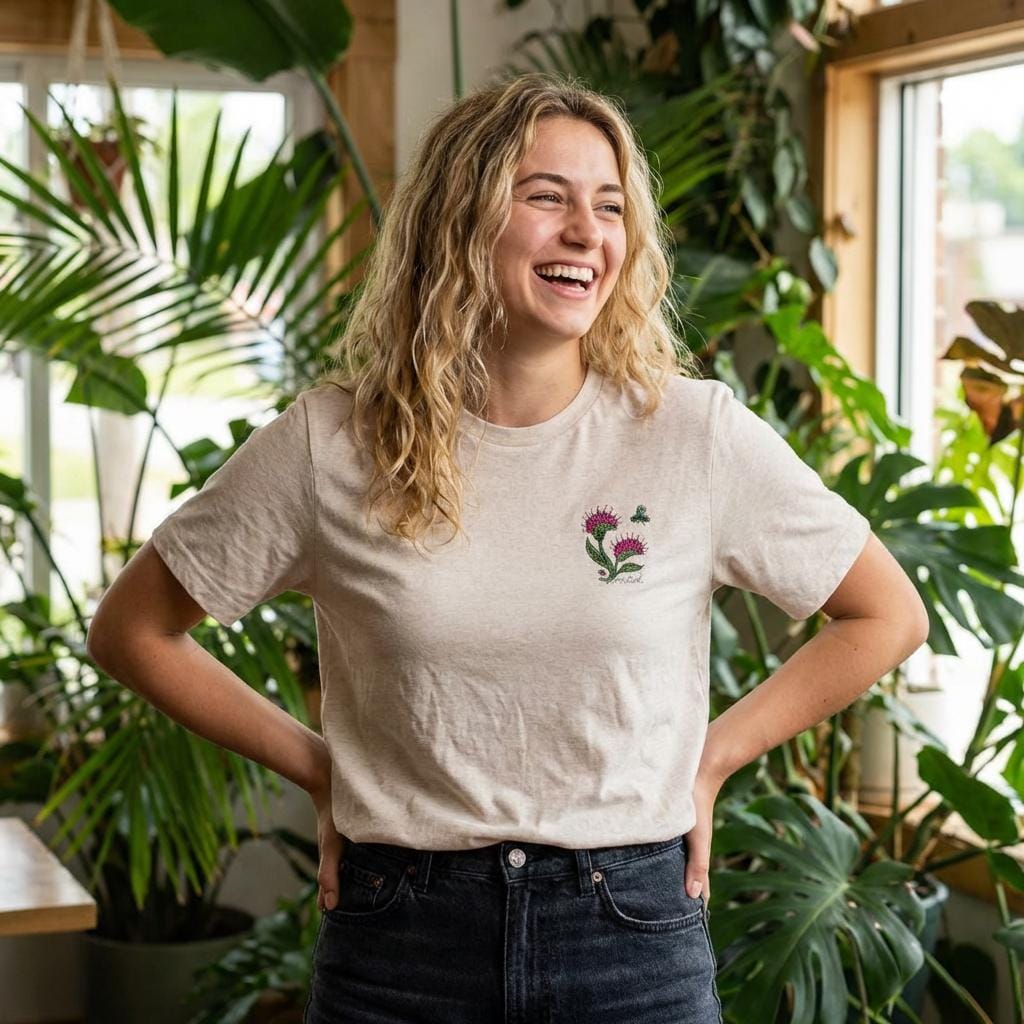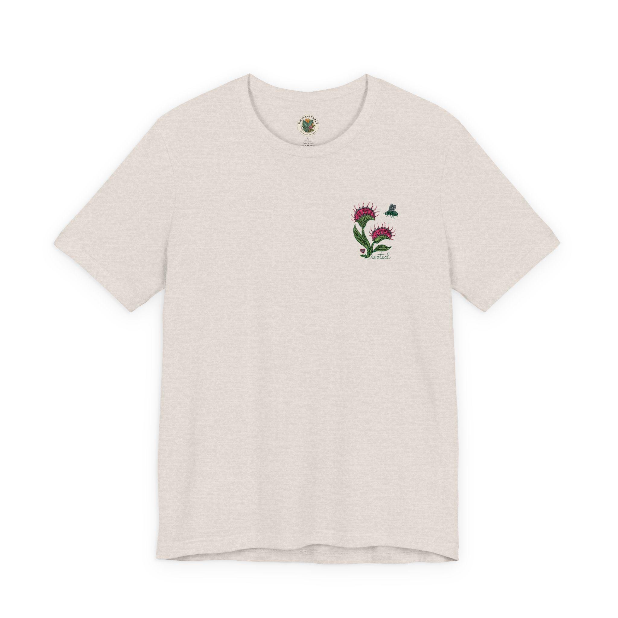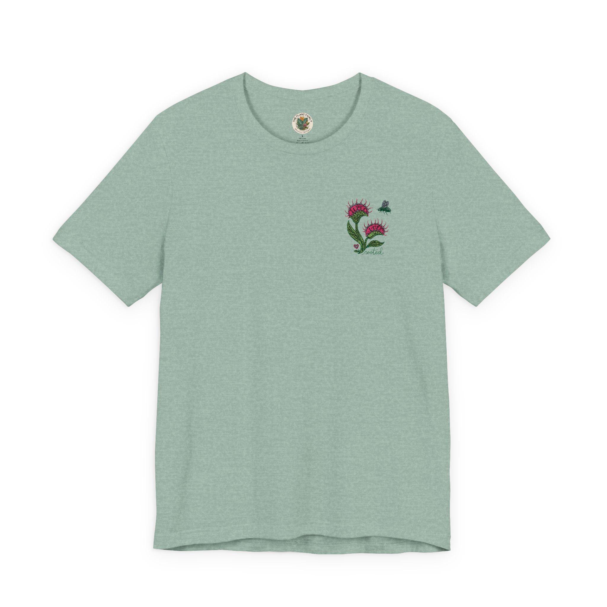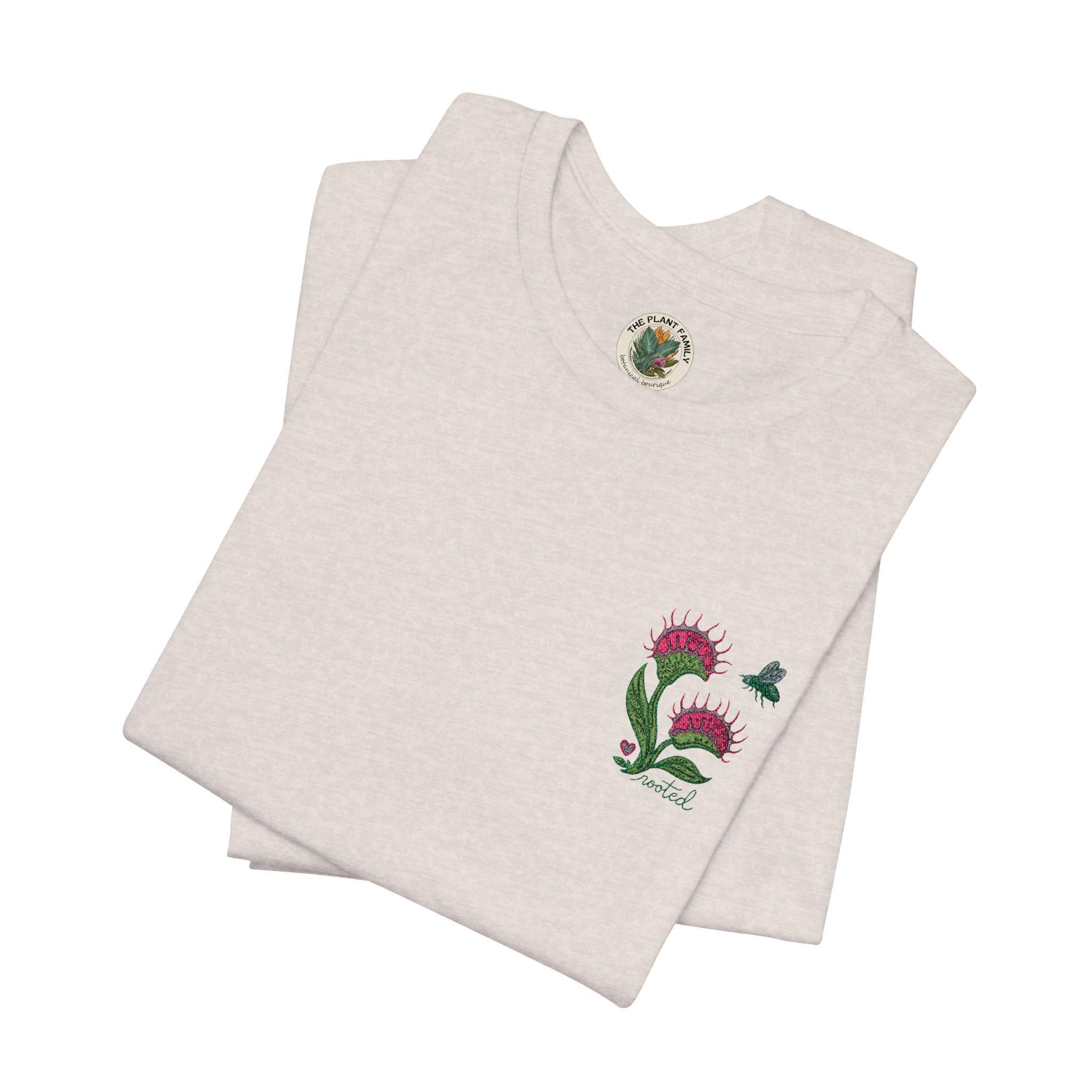 A lightweight, soft cotton tee with a small, hand-stitched-inspired Venus Fly Trap motif over the left chest. This one is for the plant lovers who appreciate something a little different. Featuring a delicate embroidered Venus flytrap design paired with the word “rooted”, this piece blends botanical beauty with a soft, meaningful touch. Designed with a subtle feminine feel and stitched in earthy, calming tones, it’s the perfect everyday piece for plant moms, collectors, and nature lovers alike. Unlike typical plant designs, this carnivorous beauty adds a unique twist — bold, a little wild, and still beautifully grounded. ✨ Details: High-quality embroidery (no cracking or peeling) Soft, comfortable fit for everyday wear Minimal, neutral design that pairs with anything Left chest embroidery for a clean, elevated look 🌿 Perfect for: Plant lovers & collectors Thoughtful gifts Cozy everyday wear Anyone who feels rooted in growth, healing, and nature Each piece is made to order with care — just like the plants you love.