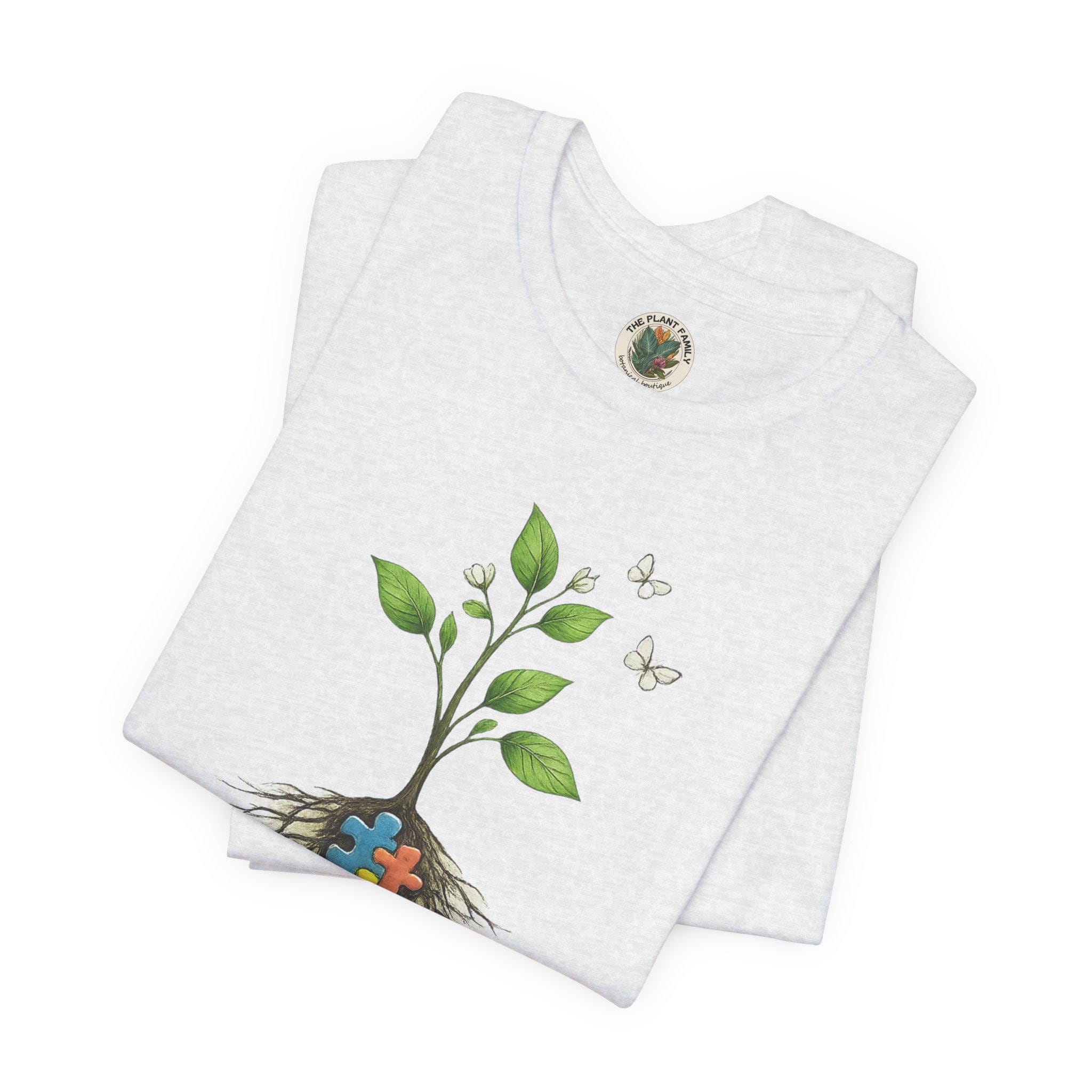 Designed with a soft botanical touch, this meaningful tee features a delicate plant and root illustration with colorful puzzle-piece detail—symbolizing love, understanding, and the beauty of growing differently.